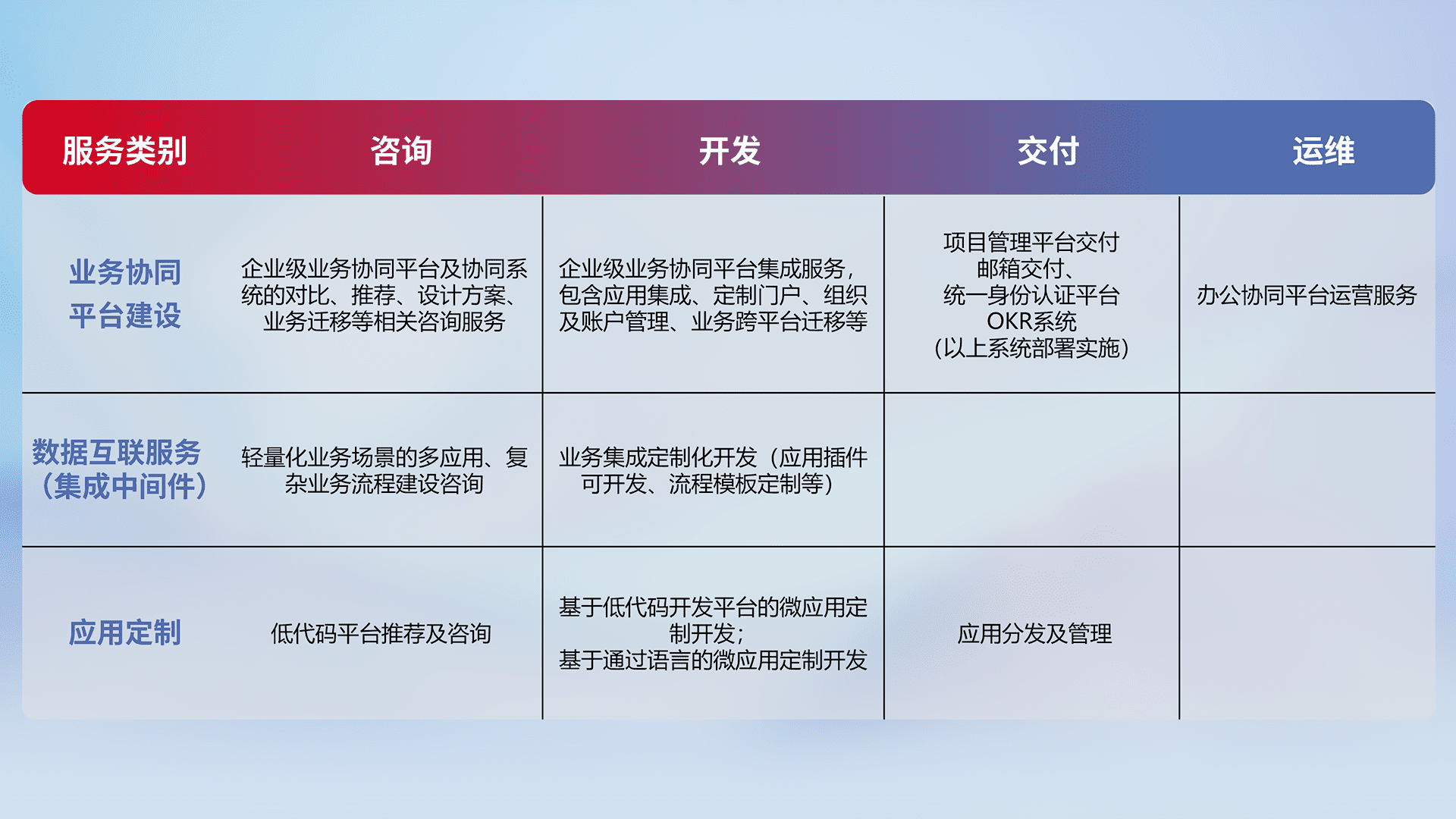 针对钉钉、、、、企微、、、IDaas等平台级产品提供产品的规划、、、、方案、、、、交付、、定制化开发等服务,,,,实现如统一协同办公、、智能客户服务、、、、混合会议管理、、、、智能数据查询、、、、等业务场景,,实现数字化转型。。。。