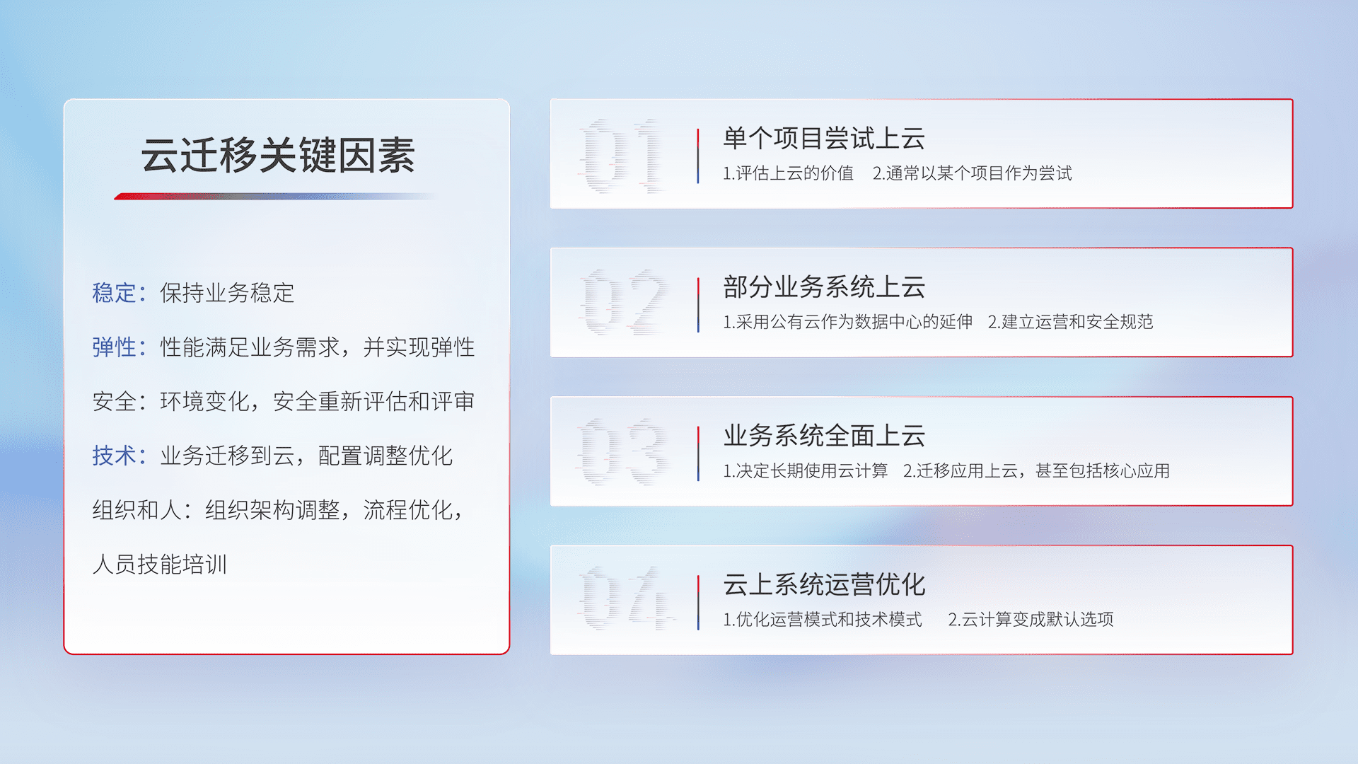 结合实际业务,,,,从规划设计、、、云平台选型、、云原生改造、、数据迁移、、、、集成交付,,,迁移全过程为客户识别最佳上云路径,,,,做好风险识别管理,,,,设计网络架构、、身份权限、、、、安全审计合规、、、操作审计、、、日志审计、、、、监控告警策略、、、多站点容灾设计等,,对云上基础设施进行整体规划,,,,提升IT治理水平,,,以满足弹性、、、高可用、、、高性能的需求。。