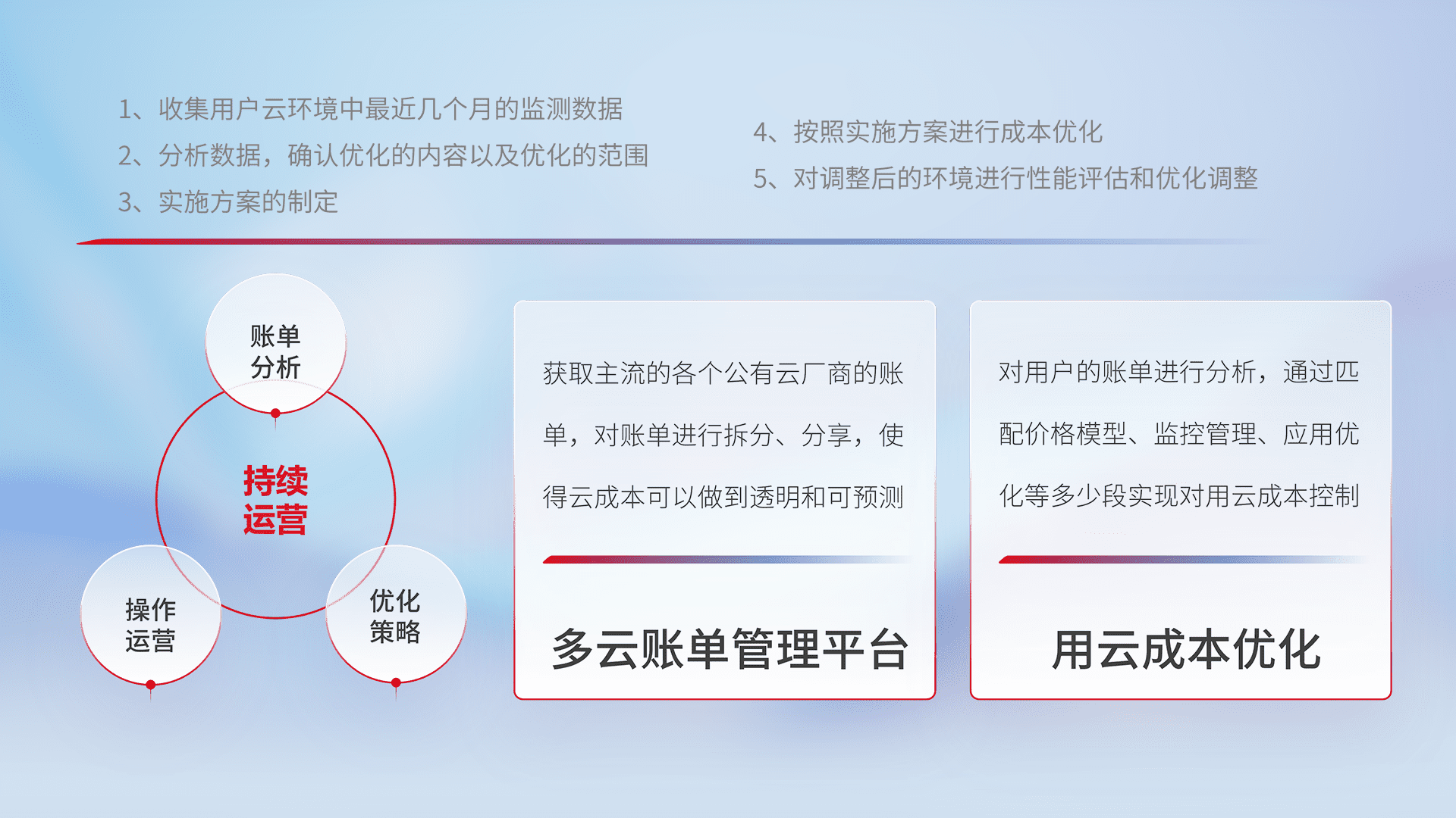 通过多云纳管,,,以统一的资源数据模型把客户的云资源进行抽象和封装,,进而实现对多云资源的统一操作,,保障云资源管理的可靠性、、、、稳定性与可用性。。量身定制化运维内容,,配置、、开发运维、、、补丁管理、、、备份、、、监控、、、、认证和访问管理、、、、审计和日常巡检等,,,保障在用云过程中的可靠度,,稳定度以及高可用率。。。。